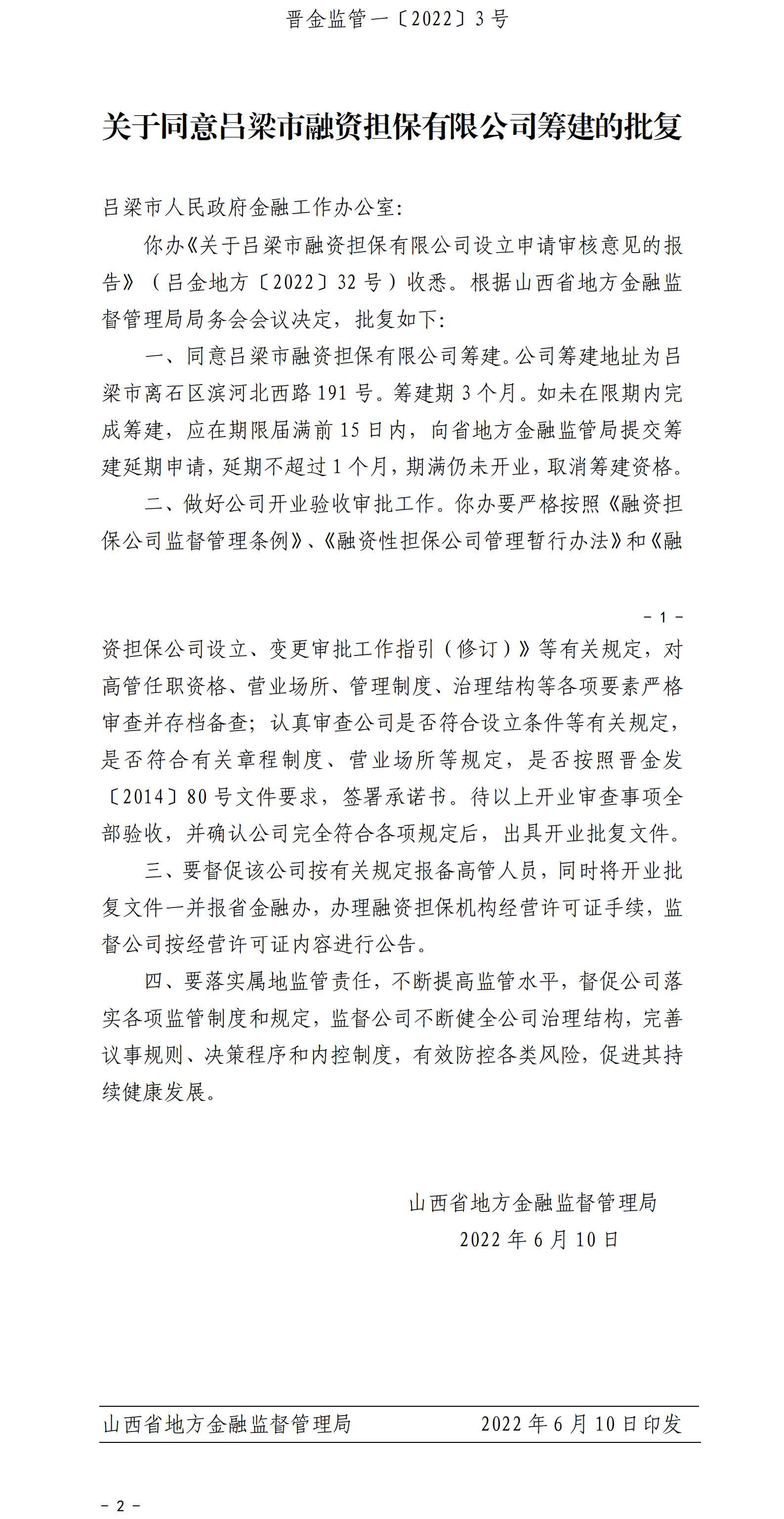 晋金监管一〔2022〕3号 关于同意吕梁市融资担保有限公司筹建的批复
