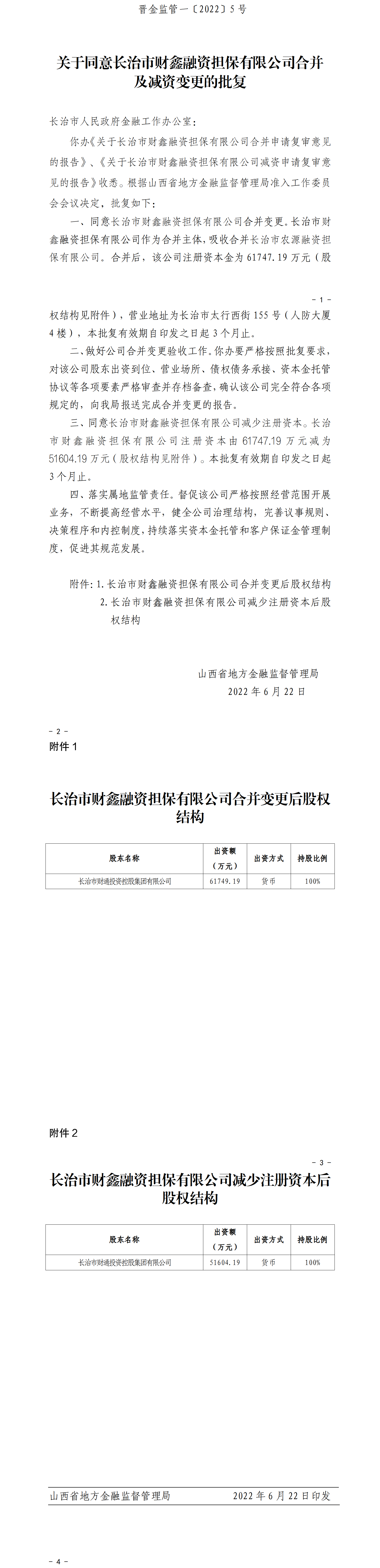 晋金监管一〔2022〕5号 关于同意长治市财鑫融资担保有限公司合并 及减资变更的批复