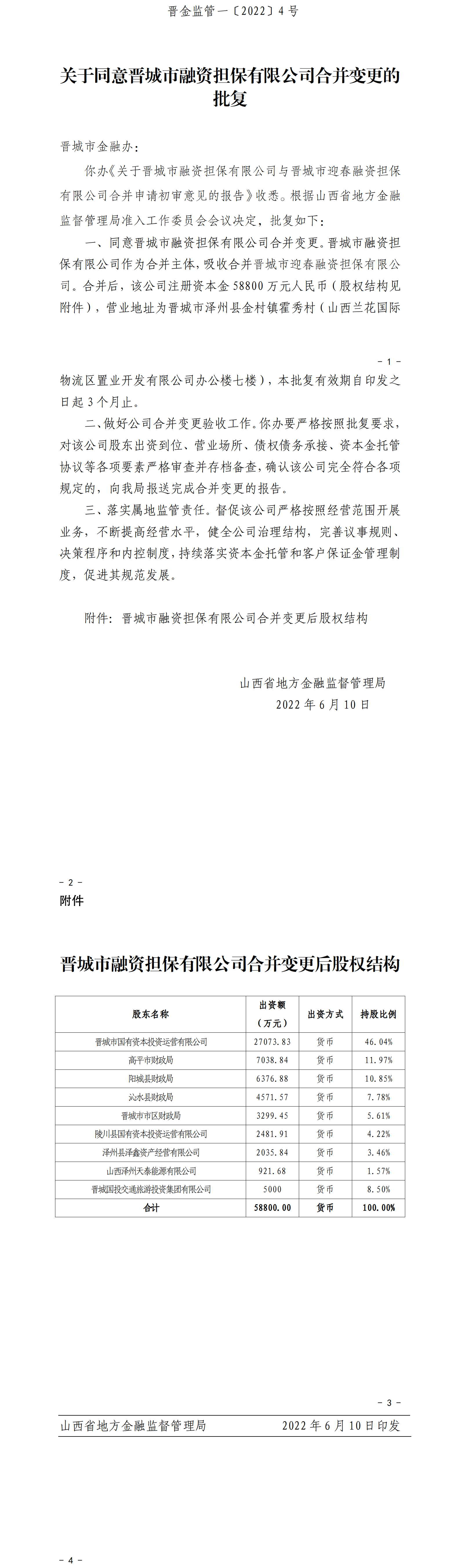 晋金监管一〔2022〕4号 关于同意晋城市融资担保有限公司合并变更的批复